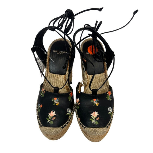 Saint Laurent Floral Print Wrap-Around Wedge Sandals – Black Rope Platform (Size 6.5)