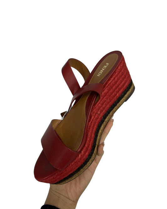 FENDI Red Leather Ankle Strap Wedge Sandals (Size 8)