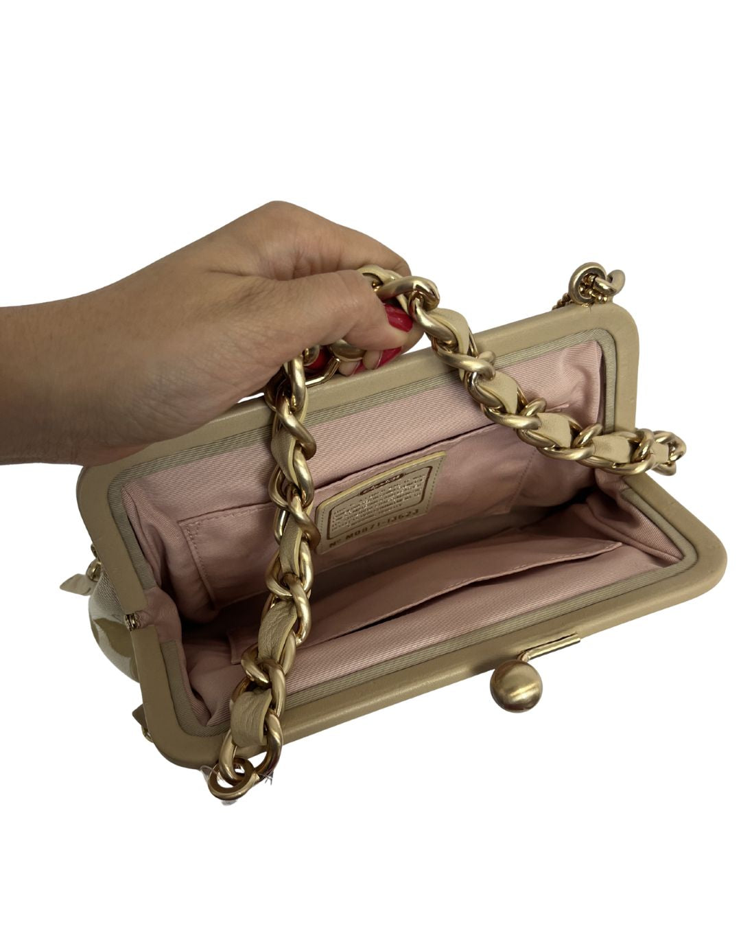 This vintage shoulder bag from Coach is new with its tag and comes in a beige/gold color. Features the Coach Op art and a braided shoulder strap. Has a light pink interior.