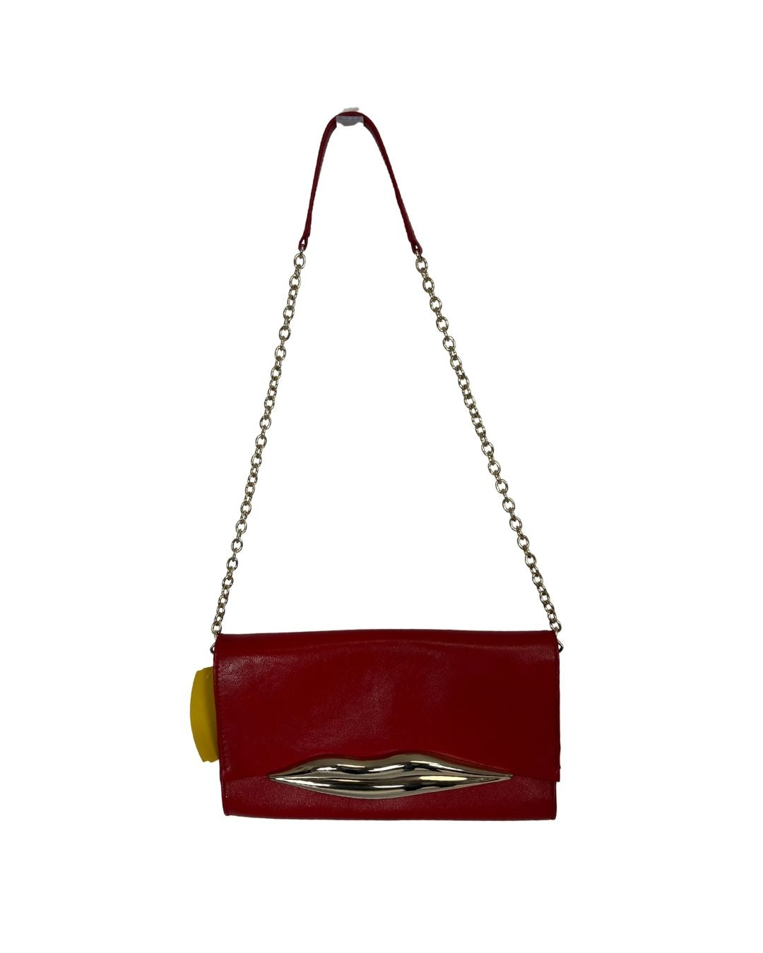 This chic red leather shoulder bag by Diane von Furstenberg features unique gold hardware lips, a flap over opening, and a gold chain. It is new with its tag.