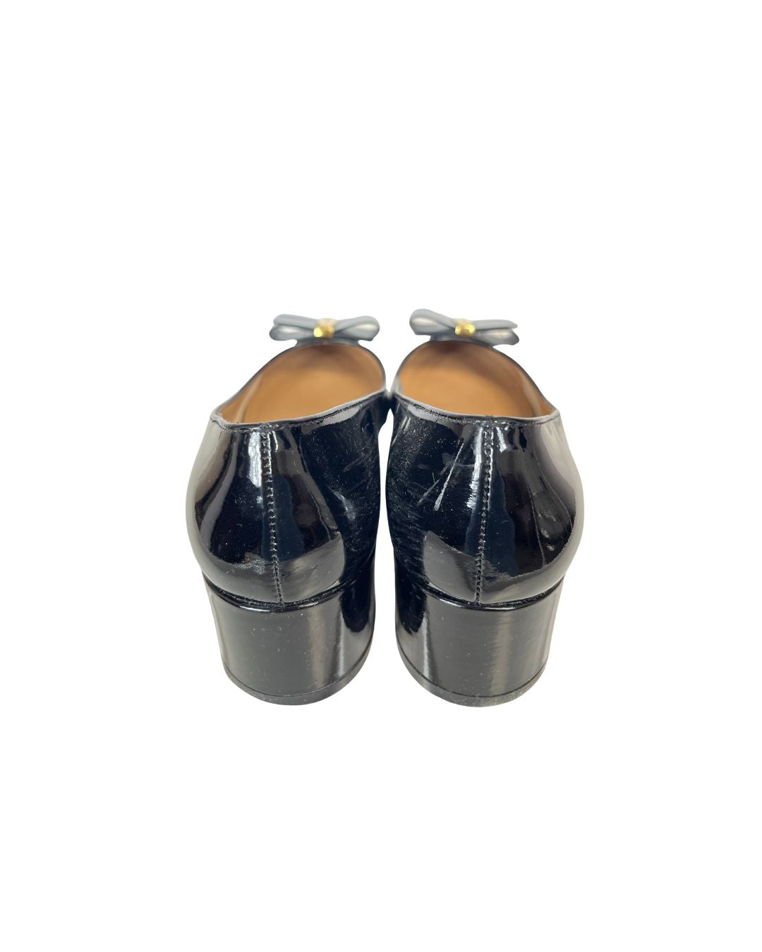 These patent leather heels by Ferragamo feature a leather bow with gold hardware. Style them elegantly for casually to elevate your look.