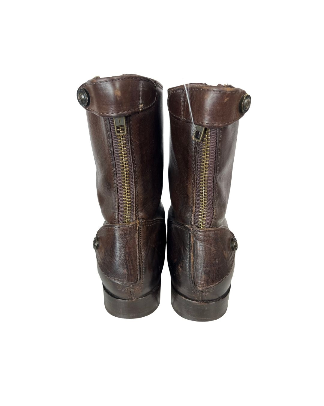 Style the iconic leather, back-zipper short ankle leather boots by Frye. You can't go wrong with an essential brown boot. Shoes have slight scratches.