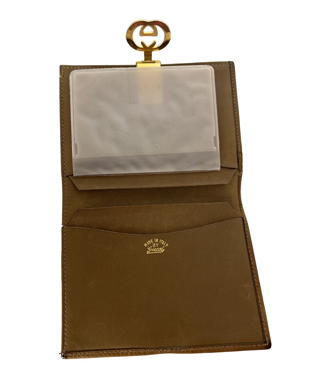 Add this rare, vintage Gucci Vintage GG Supreme leather wallet to your collection. Features a camel-colored leather trim, a gold-tone and black GG clasp.
