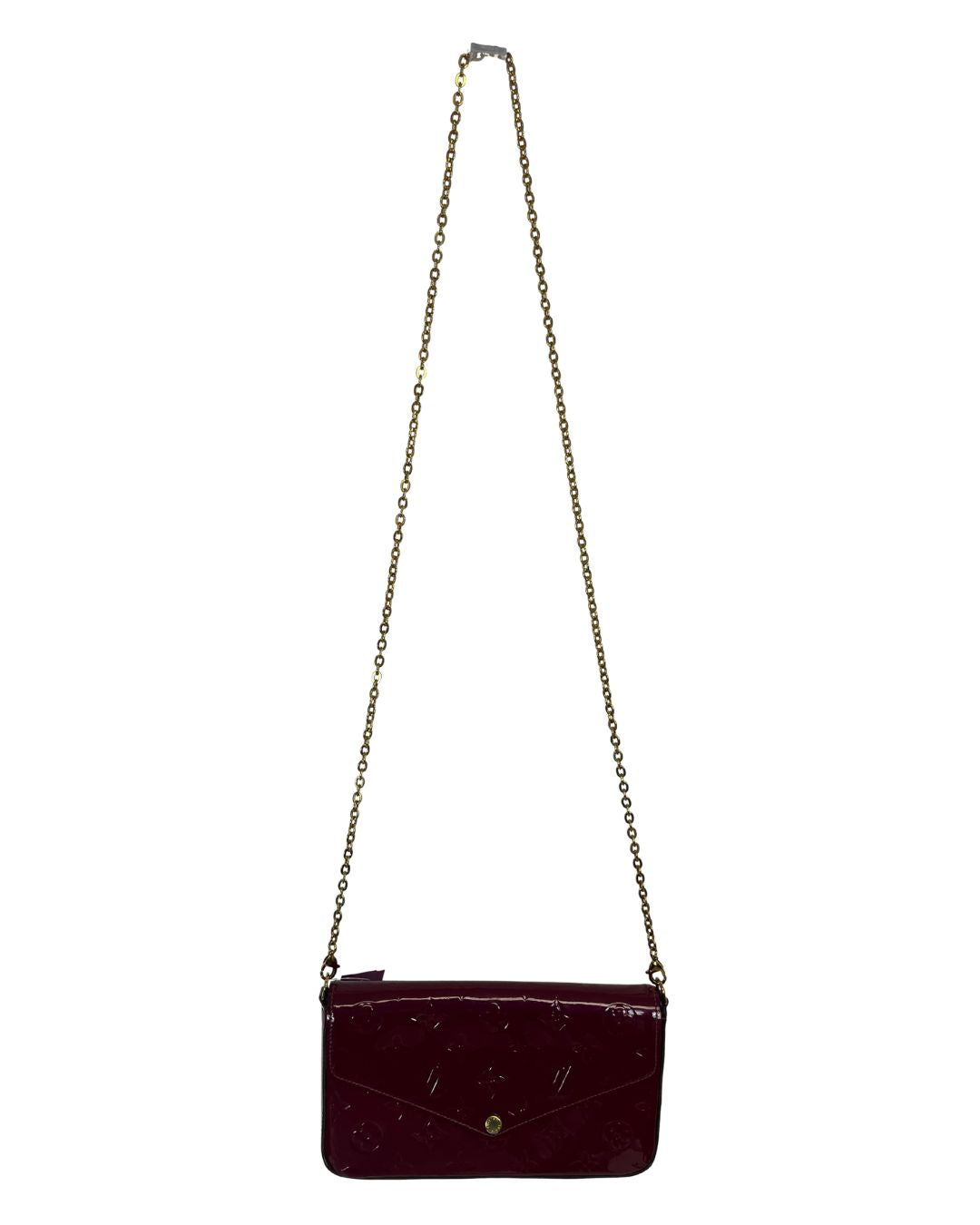 Step into style with this Louis Vuitton Felicie Pochette Monogram Vernis snap bag! The bag features gold-tone trim and a chain strap.